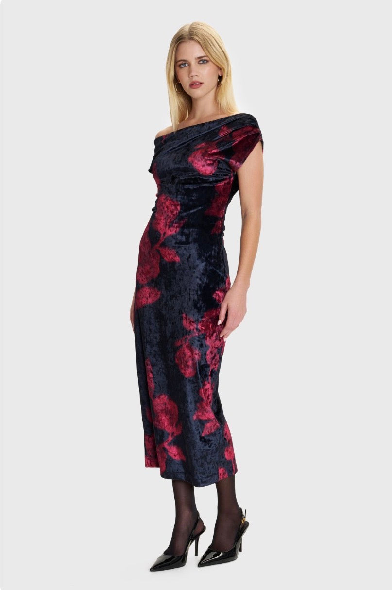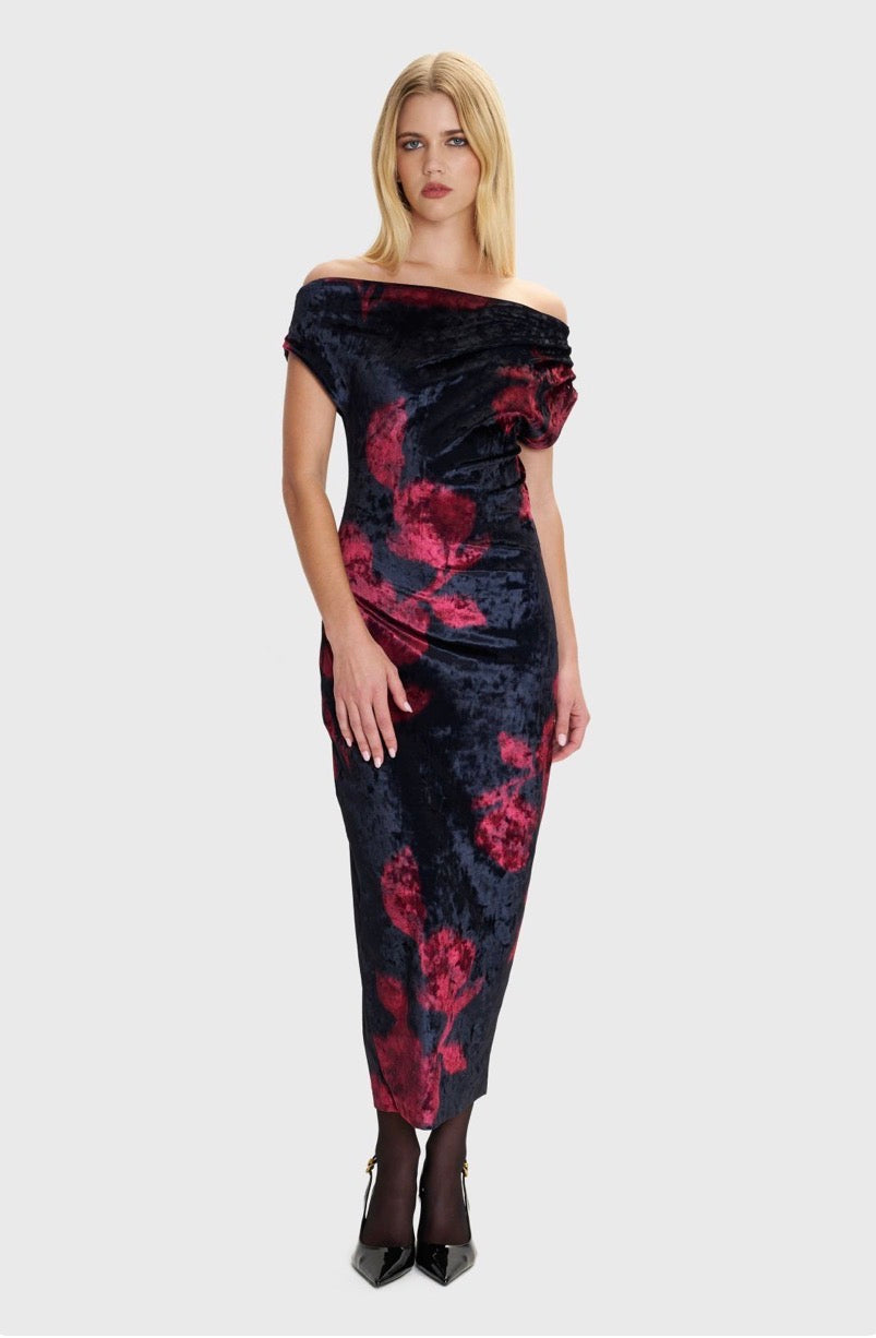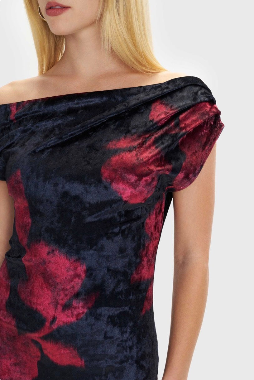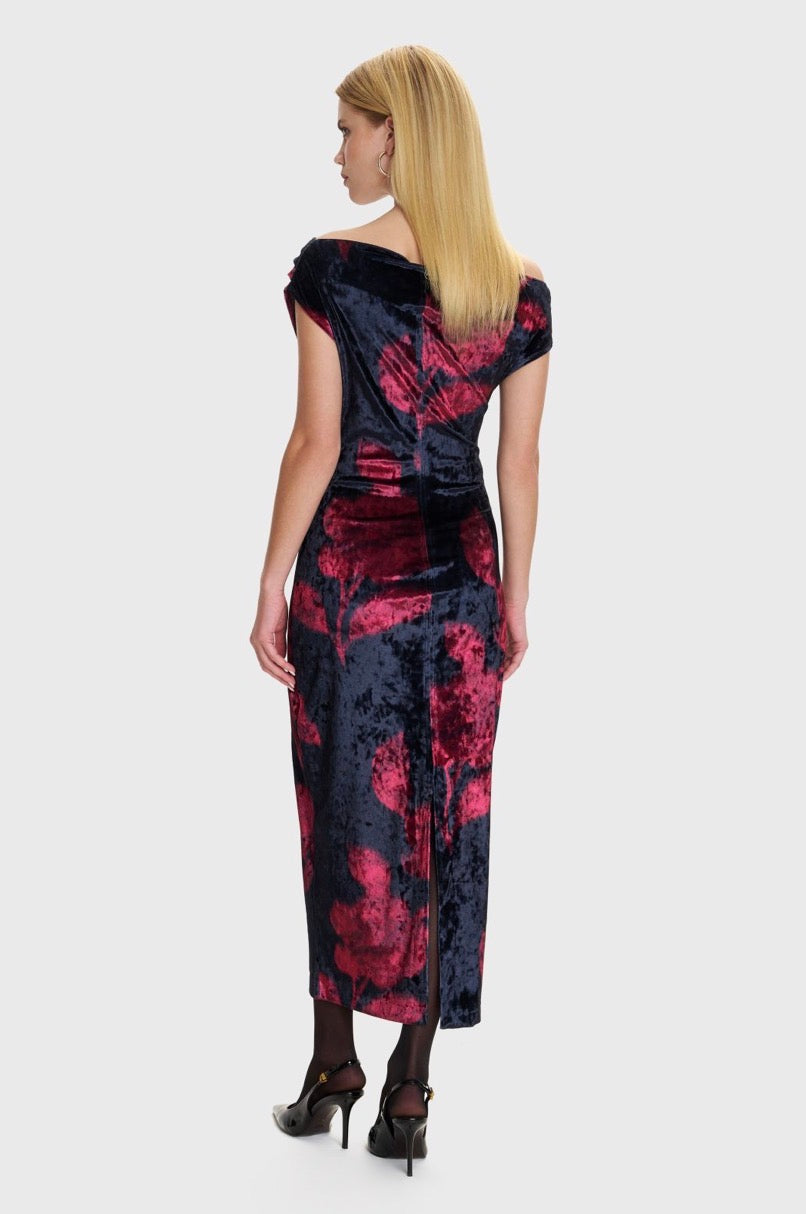 ALE - Fustan i zi veludhe i gjate me printe florale