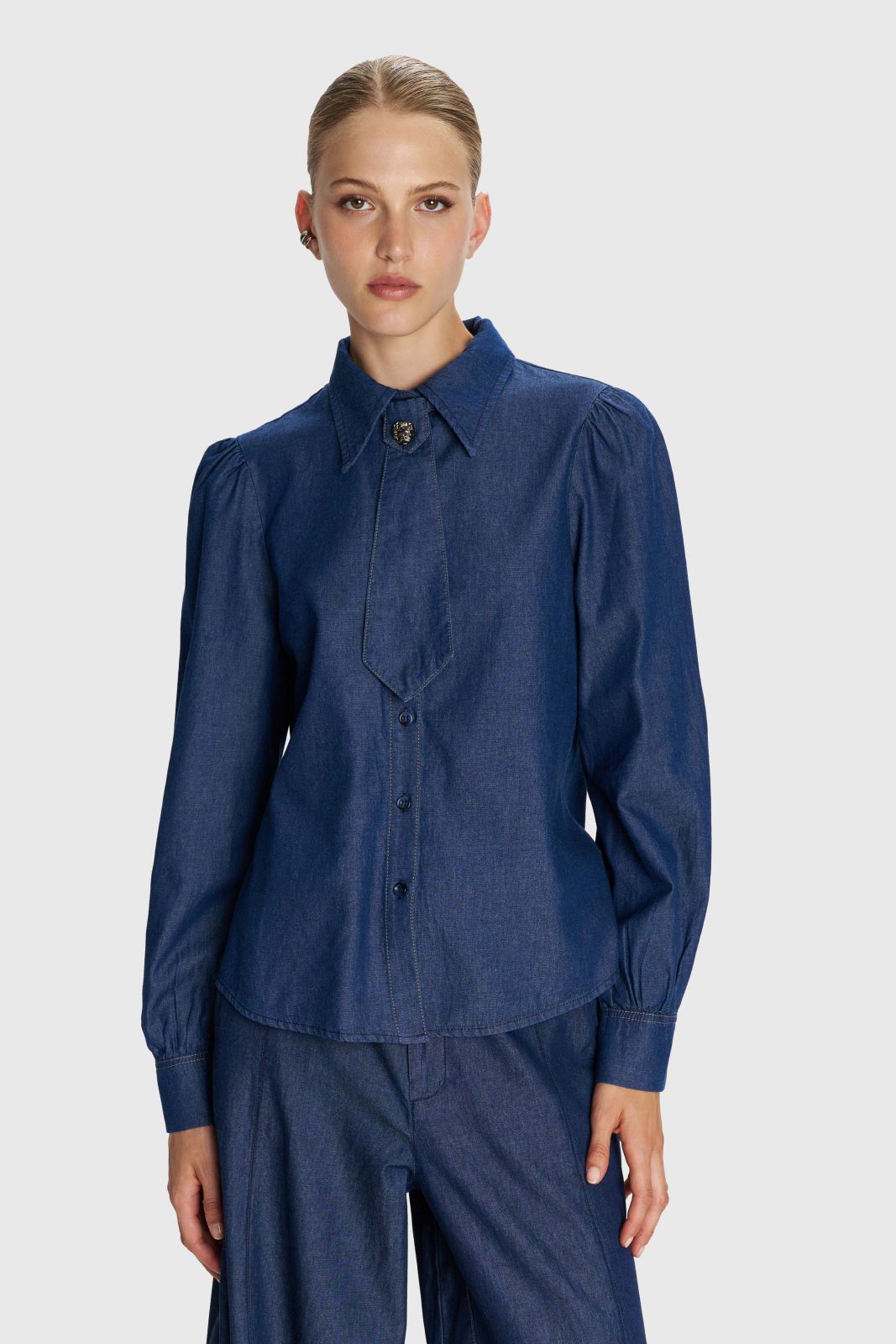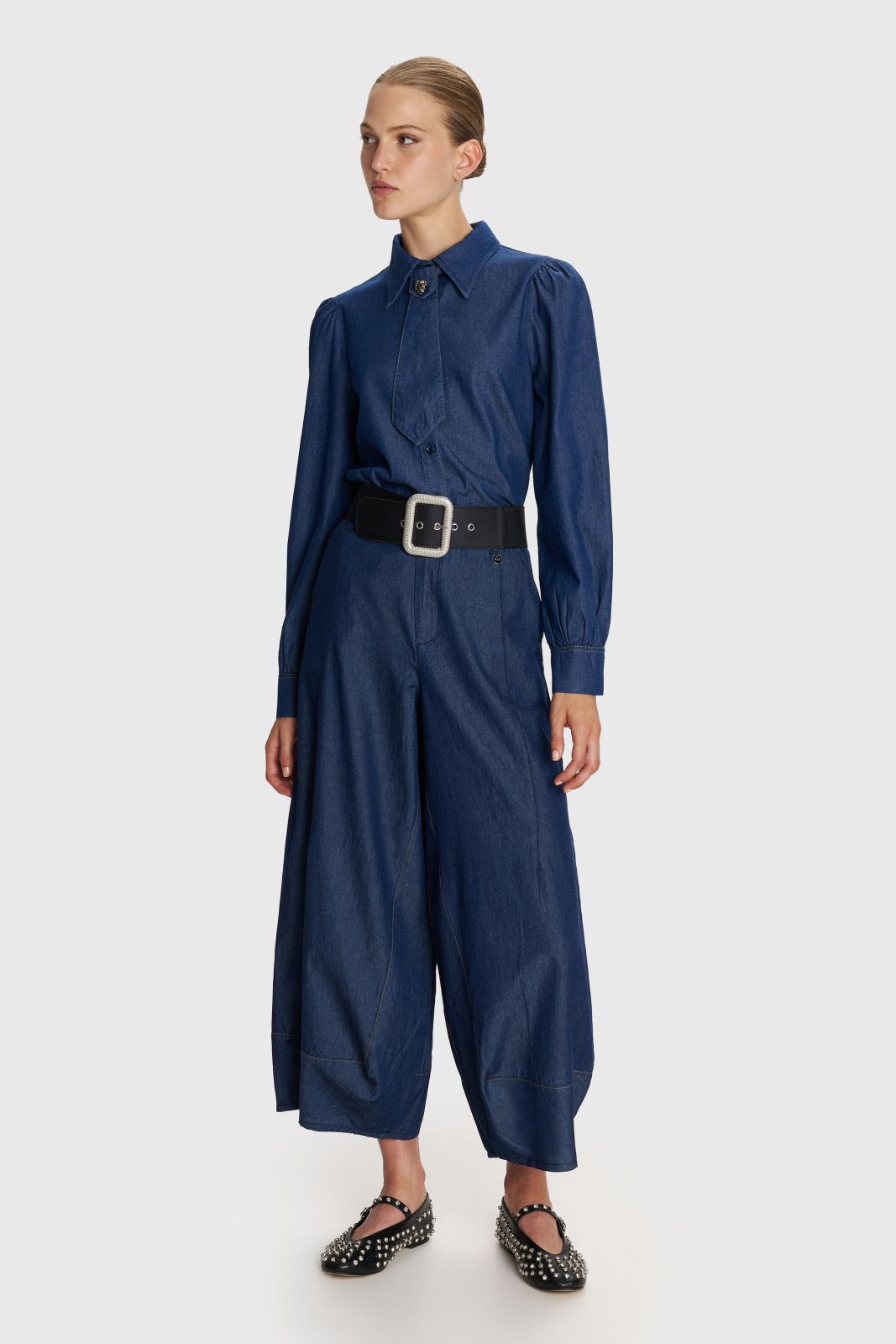 ALE - Set blu xhins i holle kemishe dhe pantallona me prerje te gjere